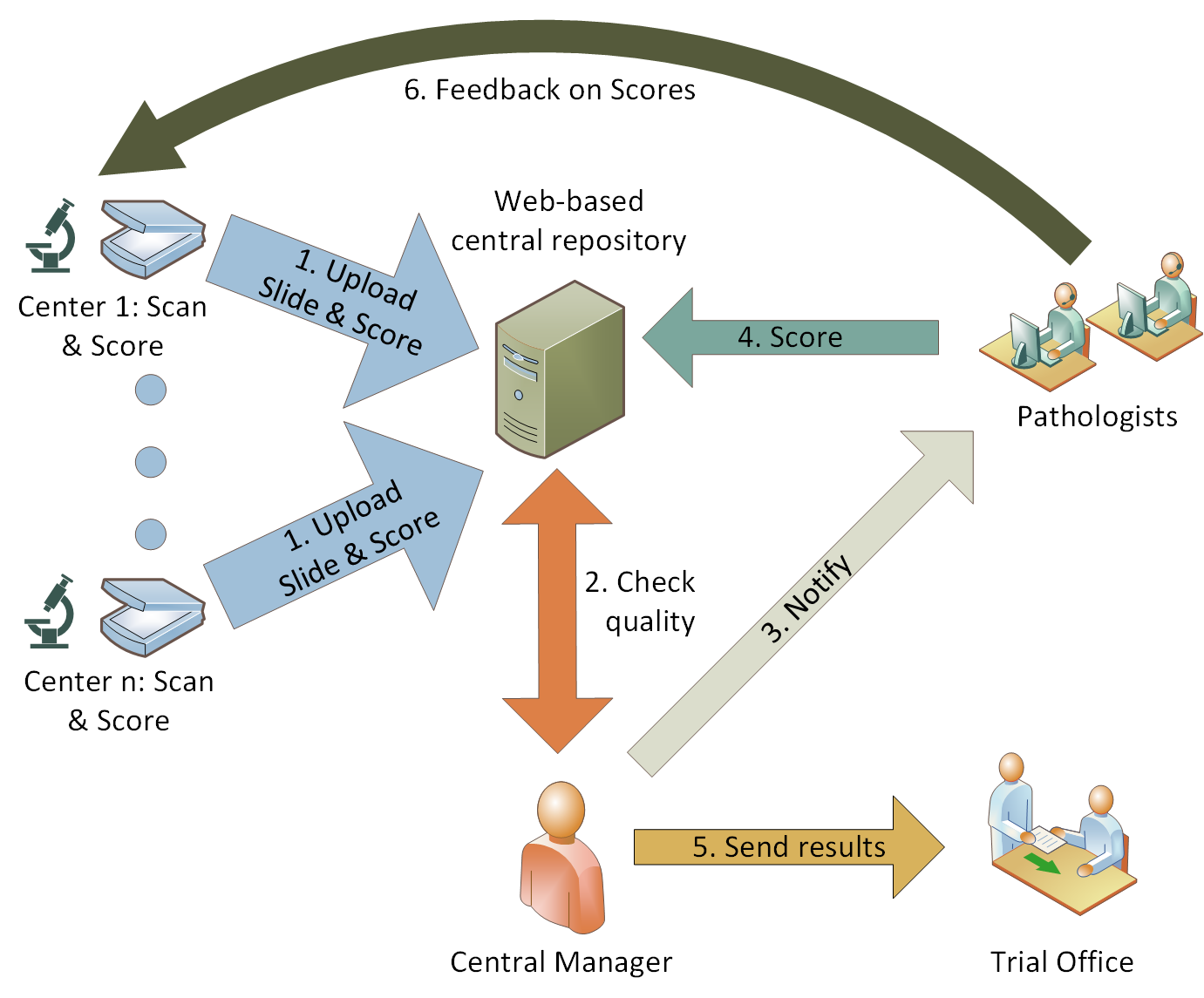 One possible workflow using the Slide Score Uploader in a multi-instutional study to assess TIL scores. Centers scan slides scored by a local pathologists and upload both to the Slide Score central repository. Central manager there coordinates with pathologists the scoring of the uploaded slide and when a consensus score is clear informs the trial office. Adapted from J. Hudecek et el. 2020